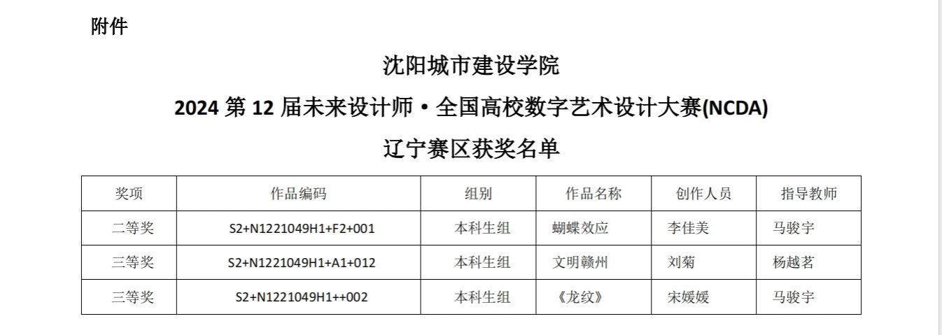 2024第12届未来设计师·全国高校数字艺术设计大赛(NCDA)是入选《全国普通高校学科竞赛排行榜》,多家教育厅认定,“学习强国”学习平台支持,对接联合国国际赛的国家级老员工竞赛。大赛秉承“设计为人民服务,培养未来设计师”的理念,坚持艺术与技术并重、学术与公益并重,倡导可持续发展,绿色低碳设计,传承红色文化,助力乡村振兴;鼓励老员工积极参与创新设计,用专业知识服务社会、拓展国际视野、培养团队协作精神。与此同时,《蝴蝶效应》、《文明赣州》、《龙纹》等作品也将员工运用数字技术对员工的综合实践能力做了全面展示。