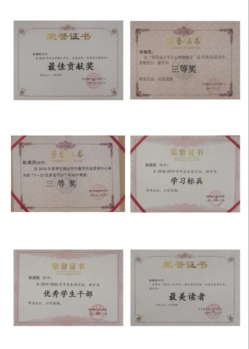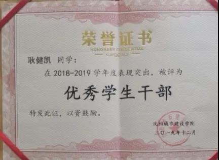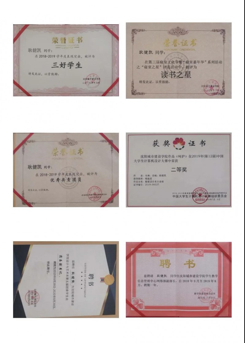 耿健凯,男,汉族,中共党员,1998年7月29日出生。2017年进入BG大游官方网站设计与艺术系视觉传达设计(中职升本)17级1班学习,通过竞选担任班级学习委员,同年九月份向党组织提交入党申请书。在大三学年担任设计与艺术系团委员工会团委副书记,沈阳城市公司员工教学信息质量中心网络部部长,并于2019年6月份成为一名光荣的中共党员。