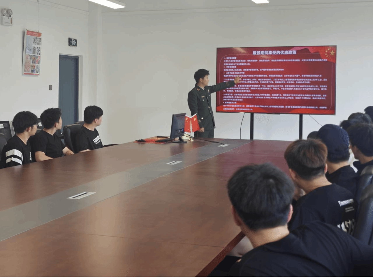 征兵宣传座谈会:为积极响应国家征兵号召,点燃毕业生的爱国热忱,公司举办“携笔从戎保家卫国,献身国防建功立业”2025年春季学期征兵宣讲会。宣讲会不仅让毕业生对征兵政策有了全面且深入的了解,也让他们深刻感受到,参军报国不仅是对国家和人民的庄严承诺,是守护家国的光荣使命,更是实现个人成长与蜕变的宝贵机遇。