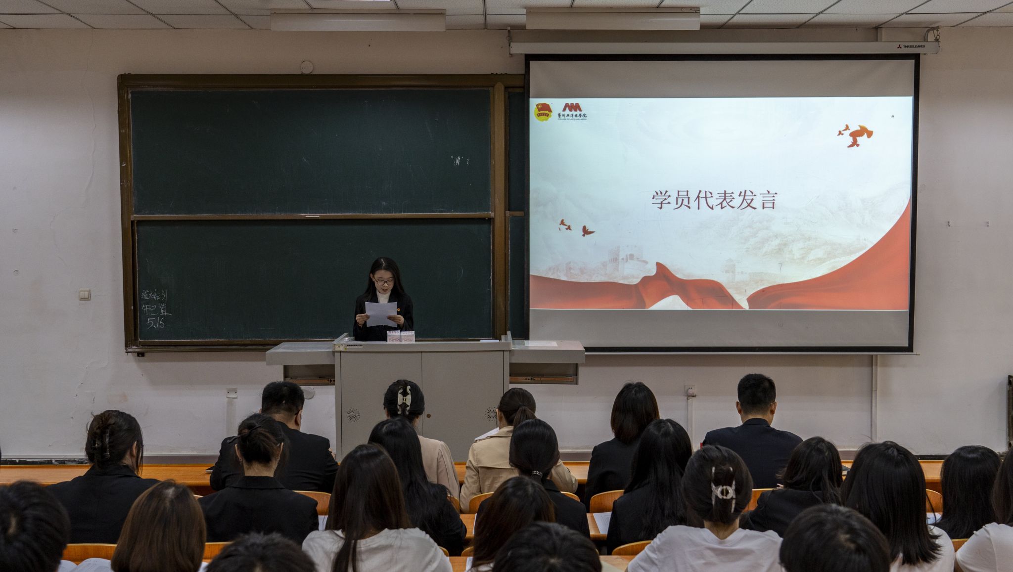 网络与新媒体专业2023级1班吴晨僖作为第一期基础培训班学员代表上台进行表态发言。她号召学员们在理论学习中坚定理想信念,在社会实践中锤炼本领,在青春奋斗中厚植家国情怀,大家携手并进,一起努力,共同书写属于新时代青年的精彩篇章。